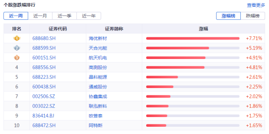 网络整理 2025-07-15 10:19证券之星光伏行业周报:中国有色金属工业协会硅业分会数据显示,本周国内硅料市场延续涨势,其中N型硅料涨幅超过P型硅料。中原证券最新观点指出,预计随着产业链上游价格逐步企稳,光伏下游价格将趋于稳定,从而带动下游装机需求。宏观方面,国家发改委等六部门文件指出,加强传统能源与新能源综合开发利用推动煤电、气电、风光电互补。企业方面,协鑫集成定增58亿加码电池片储能,爱旭股份定增60亿加码N型电池。