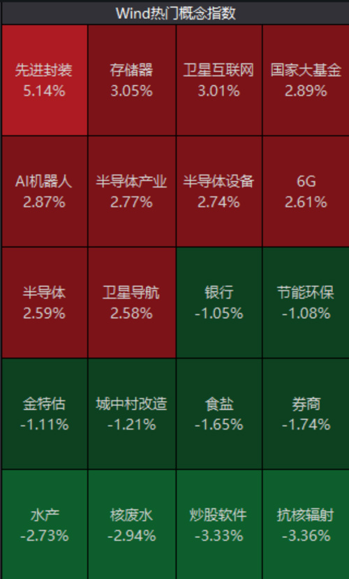 盘面上,上午半导体芯片产业链全线走高,先进封装、AI机器人、6G等概念表现居前;大金融不振,券商股整体回调,锦龙股份逼近跌停;核废水、水产、抗核辐射等概念股继续走低。
