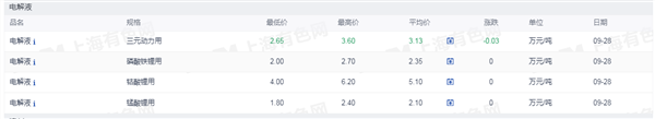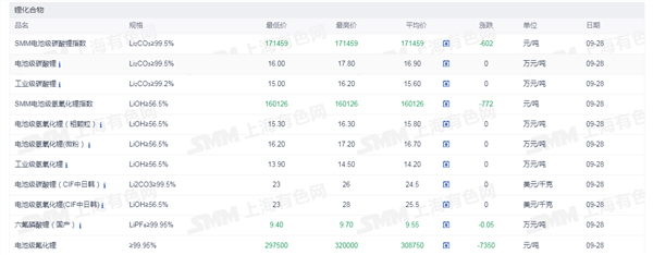 网络整理 2025-07-15 14:05证券之星新能源车行业周报:据上海有色网,截止9月28日,电池级碳酸锂16-17.8万元/吨,均价16.9万元/吨,环比上一工作日持平;工业级碳酸锂15-16.2万元/吨,均价15.6万元/吨,环比上一工作日持平。今日已是国庆小长假前的前夕,下游多数厂家已于前期完成节前小幅补库,当前市场总体成交依旧偏淡。