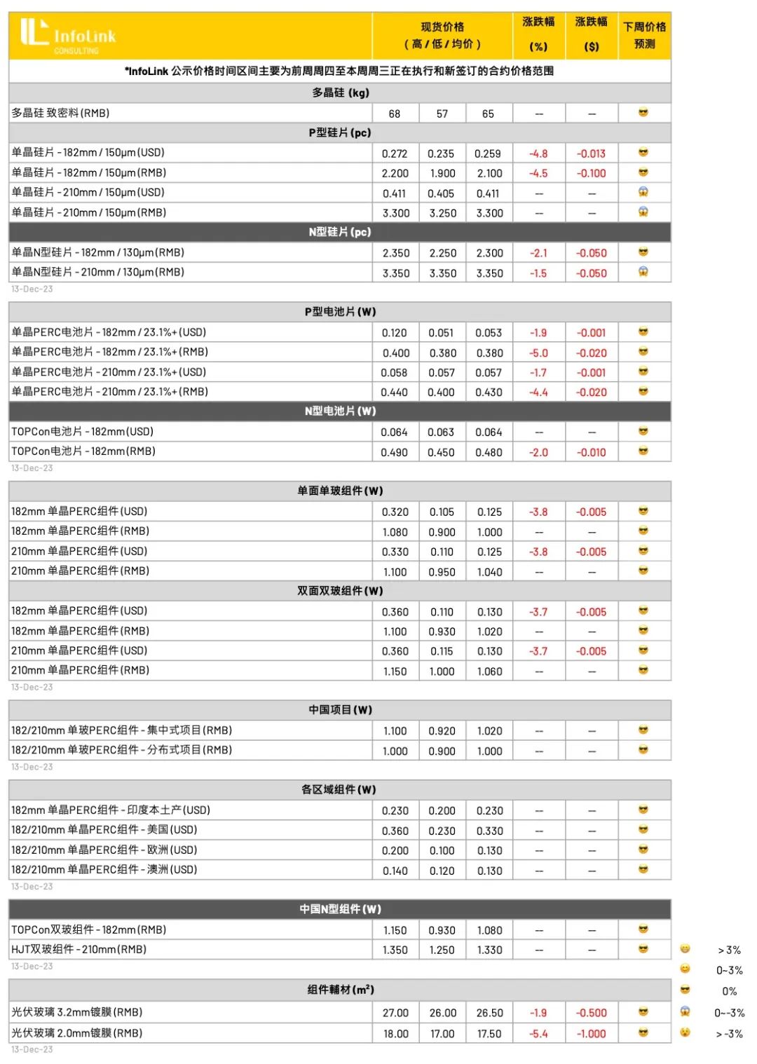 此外,13号也听闻M10 TOPCon每瓦0.45元人民币的价格正在酝酿形成,后续是否能够成为主流仍待观察,但伴随着硅片价格的下行,不排除下周TOPCon价格将突破下跌。