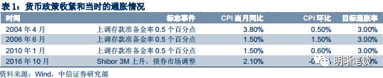 抑制通货膨胀是货币政策的重要目标之一,因此官方通胀目标对货币政策具有指导意义,但是官方通胀目标并不一定是货币政策转向的参照标准。十多年以来,我国出现了三次通货膨胀增速超过官方通胀预期目标的情况,分别出现在2003年年底、2007年以及2010年底。三次通货膨胀高于目标的情况各有不同,但是后两次通货膨胀率在高于目标之前,央行的货币政策已经有所收紧。