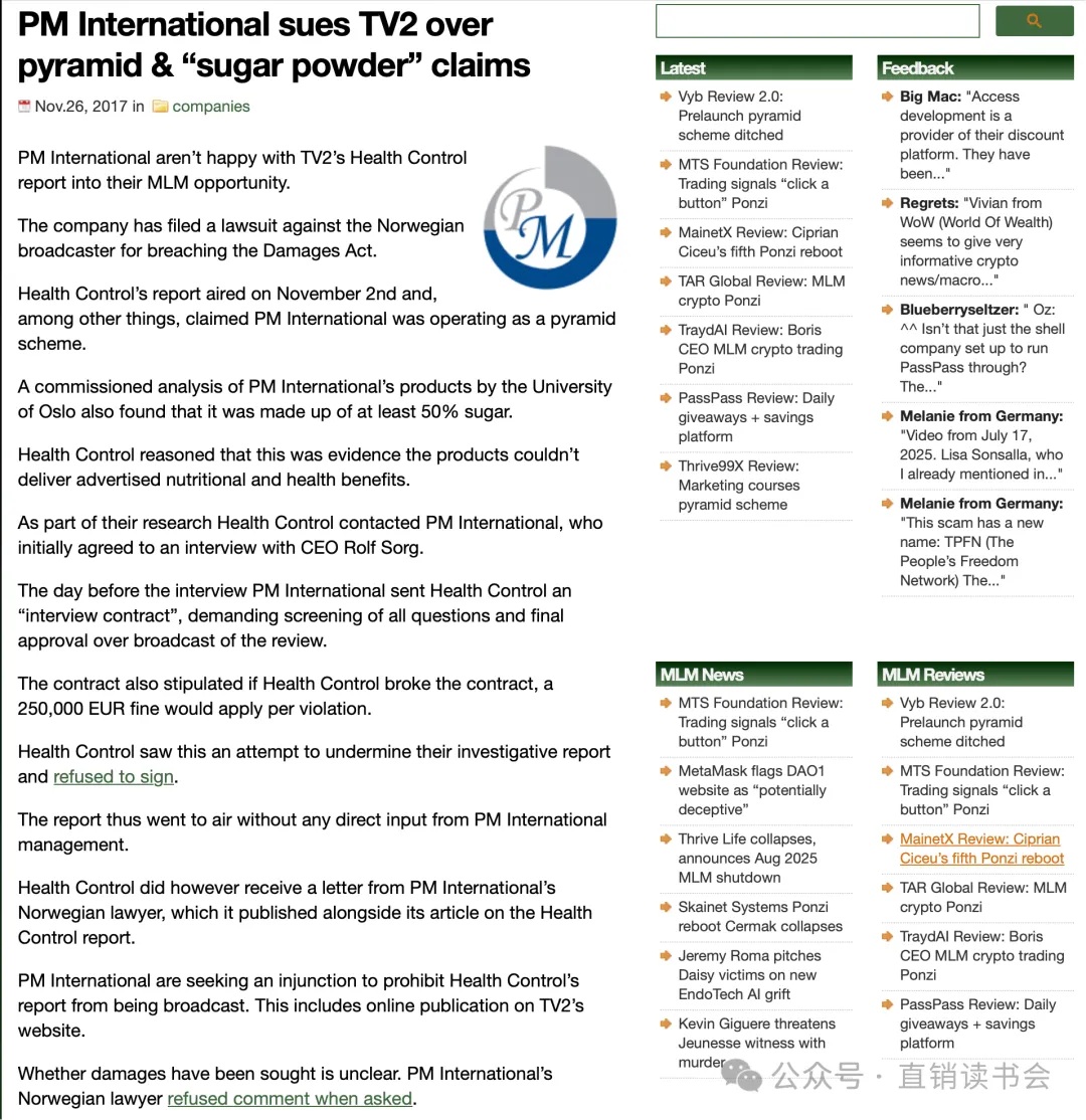 该案也反应出来PM International缺乏国际人才,硬刚媒体,无论在言论自由的国家,还是其他国家这个都是直销行业大禁忌。缺乏国际视野的法务、公关部以及品牌宣传部,虽然业绩上来,走的都是灰色地带,也就是跨国电商的方式,若不引进适合国际视野职业经理人团队,单纯的创始人一个人,走不远,也走不久!至少,在中国是行不通!