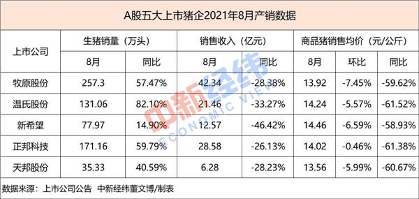 近日,A股五家“养猪大户”牧原股份、温氏股份、新希望、正邦科技、天邦股份公布8月份产销数据显示,月内商品猪销售均价同环比齐跌。
