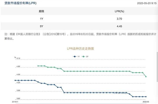 5月20日,最新公布的贷款市场报价利率(LPR)结果显示,1年期LPR报3.7%,与上次持平;5年期以上品种报4.45%,上次为4.6%,较上次下降0.15个百分点。