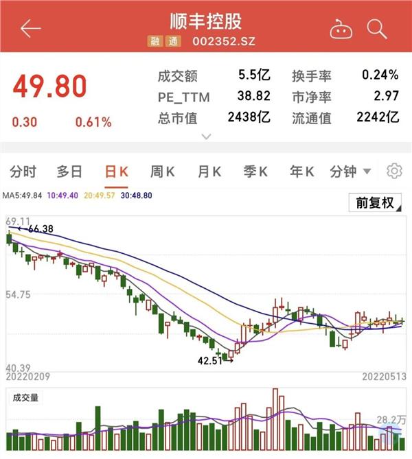 业绩方面,去年一季度顺丰大幅亏损9.89亿元;今年一季度顺丰扭亏为盈,实现净利润10.22亿元。但经营状况向好却未能止住股价持续下跌。今年以来,公司股价累计下跌27.74%。截至一季度末,顺丰控股股东户数为22.02万户。