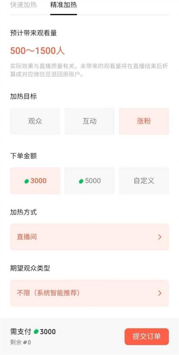 以观众为目标的情况下,下单金额的档位分类与“快速加热”功能一致;以互动为目标的情况下,下单金额分别为2000微信豆预计带来333-1000人观看量,3000微信豆预计带来500-1500人观看量及自定义;以涨粉为目标的情况下,下单金额分别为3000微信豆预计带来500-1500人观看量,5000微信豆预计带来833-2500人观看量及自定义。