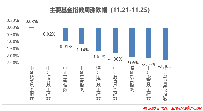 上周各大基金指数全面回调,由于国内A股、恒指相关指数表现都比较差,仅外围表现比较好,所以严重影响了跟踪的基金涨势。其中QDII型基金领跌,跌幅在-2.3%,中证股基、深证乐富跟跌,也都跌超了2%;周内由于央行投放短期资金,债基下跌幅度大幅收窄,仅跌0.02%,暂时减弱了市场恐慌程度;其余指数跌幅在1%左右及以上;货基在权益市场和债券市场下挫的情况下依旧比较稳健,变化不大。