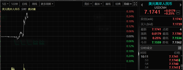 受此影响,人民币汇率快速走低。美元兑离岸人民币快速刺穿7.1700元关口,其跌幅一度扩大至200点以上。