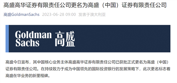 2023年6月28日,高盛高华正式更名高盛(中国)证券有限责任公司。