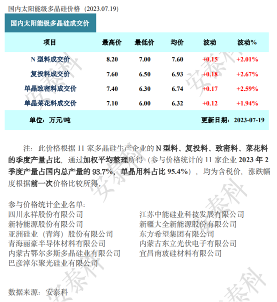 网络整理 2025-09-01 08:42证券之星光伏行业周报:中国有色金属工业协会硅业分会数据显示,本周硅料库存消化明显,多晶硅价格小幅上涨。浙商证券最新观点指出,HJT电池重大突破临近,预计2023年逐步实现盈利,2024年有望引来产业化大年。宏观方面,国家能源局数据显示,今年上半年我国可再生能源发电总装机突破13亿千瓦,其中太阳能发电装机4.71亿千瓦。企业方面,阿特斯7月19日公告显示,确定投资建设呼和浩特阿特斯电子材料科技有限公司年产20GW单晶拉棒、40GW单晶坩埚项目以及年产10GW切片+10GW电池+5GW组件+5GW新材料项目,预计投资金额分别为80亿元以及60亿元。