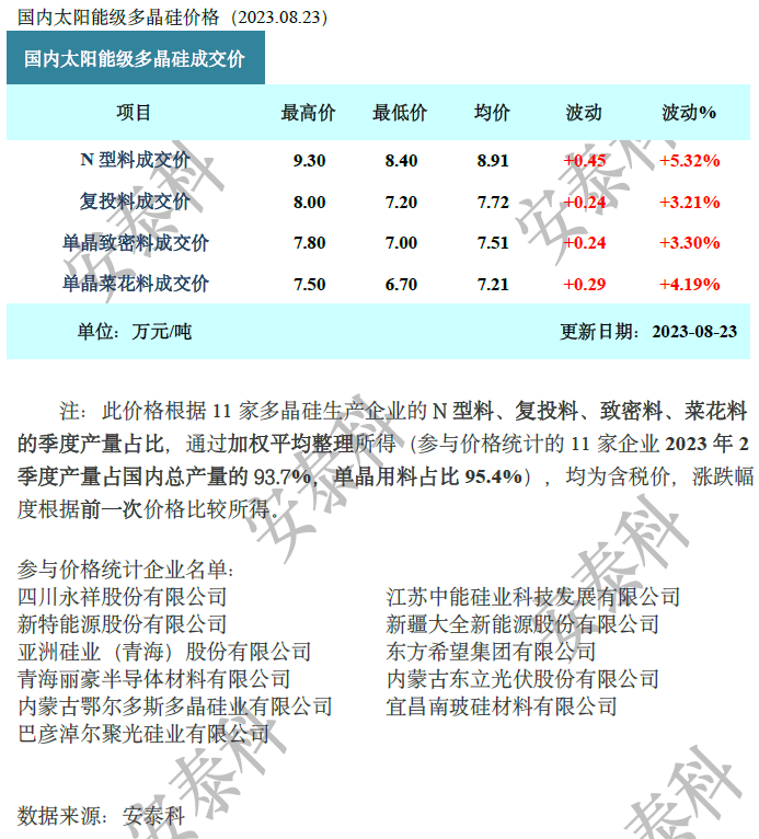 随着厂家后续在新价格的执行落实下,预期下周硅片价格维稳看待,9月份的价格走势仍需多方评估,不论硅片生产消纳能力,硅料的涨价动能支撑、甚至电池环节的价格走势,都将牵引硅片环节后续价格变化。
