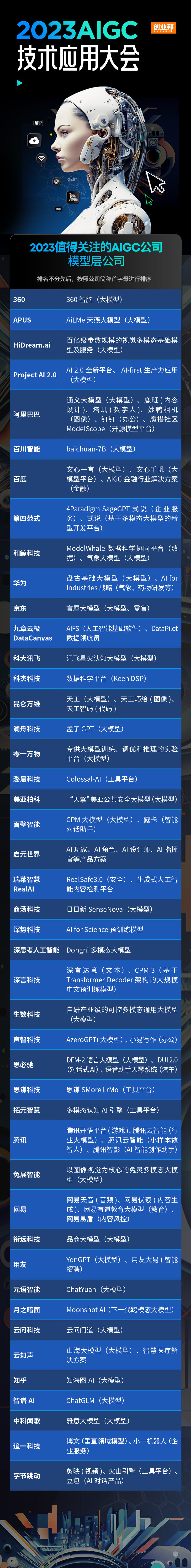 由此,创业邦研究中心启动“2023值得关注的AIGC公司”的研究,以专业的视角发掘现阶段积极探索AIGC技术和应用的企业,希望对接企业和场景,推动技术落地。