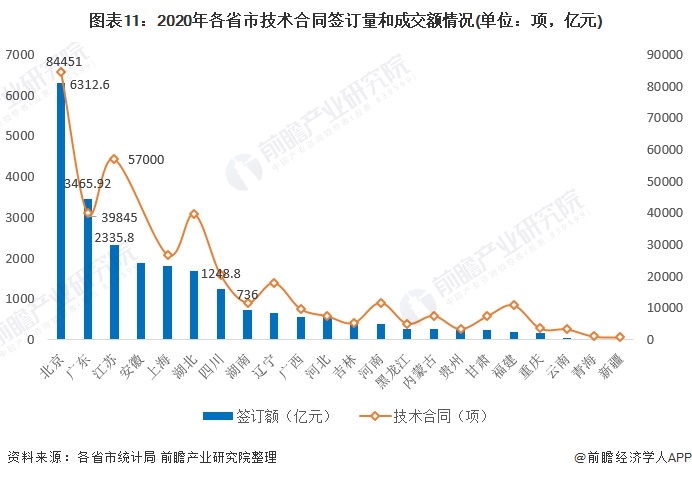 各省市方面,北京2020年共签订各类技术合同84451项,技术合同成交总额6316.2亿元,稳居全国首位。广东则以3465.92亿元(+52.5%)技术合同成交额,位居第二;江苏省共签订各类技术合同5.7万项,技术合同成交额达2335.8亿元,比上年增长39.4%,位居全国第三。