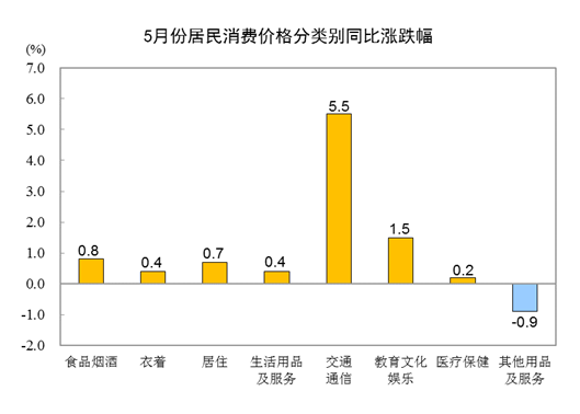 同比看,5月CPI上涨主要是去年价格变动的翘尾影响扩大所致。其中食品烟酒类价格同比上涨0.8%,影响CPI(居民消费价格指数)上涨约0.24个百分点。
