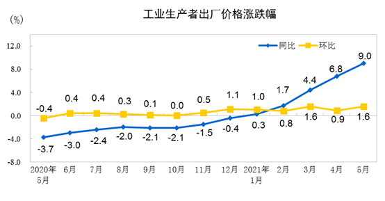 中国5月全国工业生产者出厂价格(PPI)同比上涨9%,涨幅为2008年以来最高,超过前值上涨6.8%;环比上涨1.6%。工业生产者购进价格同比上涨12.5%,环比上涨1.9%。1—5月平均,工业生产者出厂价格比去年同期上涨4.4%,工业生产者购进价格上涨5.9%。