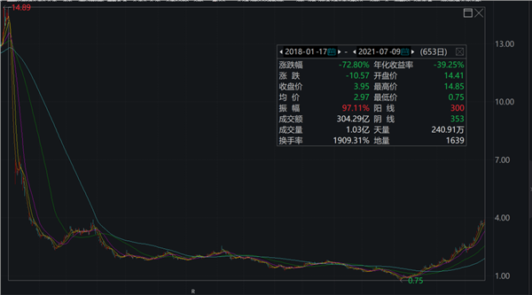 而*ST新光作为曾经市值300亿元的上市公司,虽然今年以来大涨400%,但股价自2018年初至今跌超70%,最新市值为72亿元。