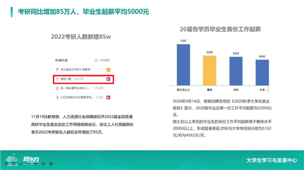 同时,我们也看到在就业方面,研究生学历毕业生首份工作平均的薪酬有七千多元。很多大学生都认同有更高的学历,可在未来的职场中有更大的平台、更多的机会、更高的薪酬,所以更多的人会选择考研这个方向进行深造。