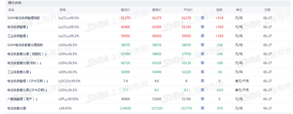 网络整理 2025-11-17 14:44证券之星新能源车行业周报:据上海有色网,截止6月27日,电池级碳酸锂6.04-6.19万元/吨,均价6.115万元/吨,环比上一工作日上涨550元/吨;工业级碳酸锂5.905-6.005万元/吨,均价5.955万元/吨,环比上一工作日上涨550元/吨,碳酸锂现货成交价格重心呈现震荡上行。当前碳酸锂市场仍延续供大于求的基本格局,供需矛盾依然突出。从供应端看,市场可流通货源充足,库存压力尚未得到有效缓解。近期碳酸锂价格的阶段性回升主要受宏观及市场情绪等外部因素驱动,而非基本面改善所致。需求侧方面,下游正极材料企业仍保持审慎的采购策略,以刚性需求采购为主,尚未出现明显的补库意愿,市场整体观望情绪浓厚。在此市场环境下,下游材料企业更倾向于通过长协加量的方式锁定采购成本,以确保原料供应的稳定性。