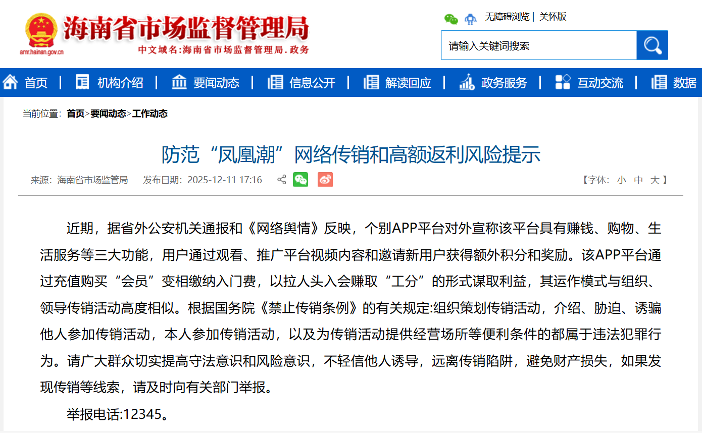 海南省市场监管局发布防范“凤凰潮”网络传销和高额返利风险提示