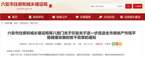 1月4日,六安市住建局等八部门联合发布《关于进一步促进全市房地产市场平稳健康发展的若干政策》,从落实企业帮扶措施、支持合理住房需求、完善房地产市场金融服务等三方面提出12条政策。