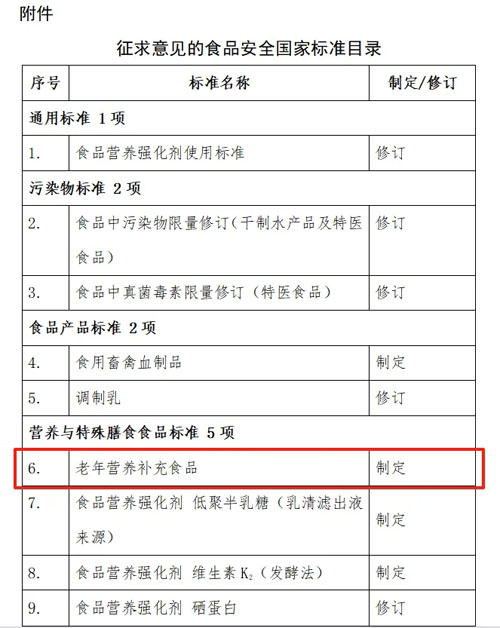 网络整理 2025-08-31 03:188月1日,食品安全国家标准审评委员会秘书处发文于征求《食品安全国家标准 食品营养强化剂使用标准》等30项食品安全国家标准(征求意见稿)意见,其中《食品安全国家标准 老年营养补充食品》作为我国首个针对老年人群的营养补充食品强制性国标,被列入《征求意见的食品安全国家标准目录》第 5 项。标志着长期 “野蛮生长” 的银发营养市场,即将迈入标准化、规范化发展的新阶段。
