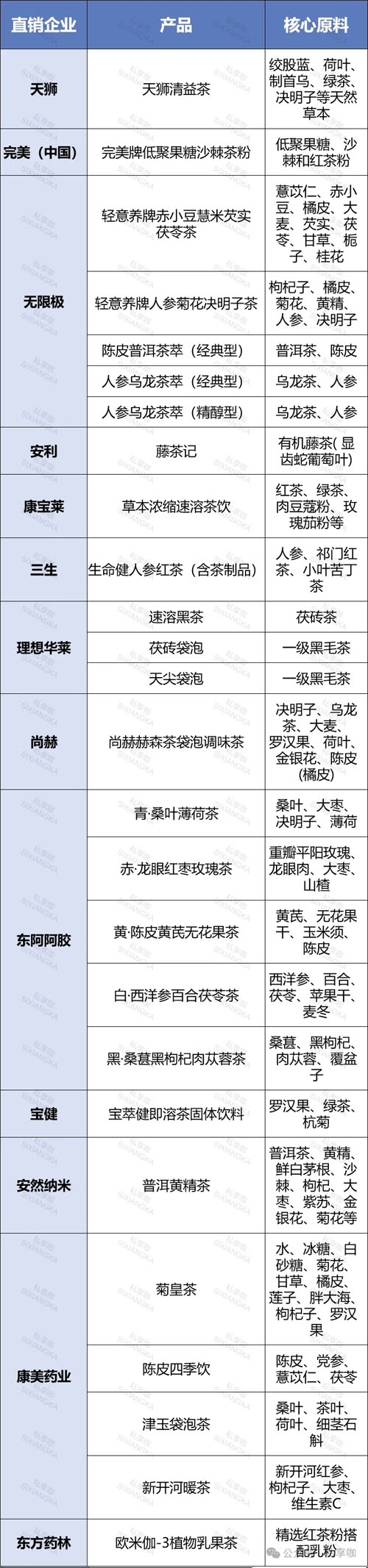 据不完全统计,13家直销企业推出了26款茶饮产品。与公域市场针对年轻人推出的新茶饮不同,直销企业的茶饮产品更加强调健康与功能性,主打“药食同源”成分,常加入枸杞,人参等草本原料。