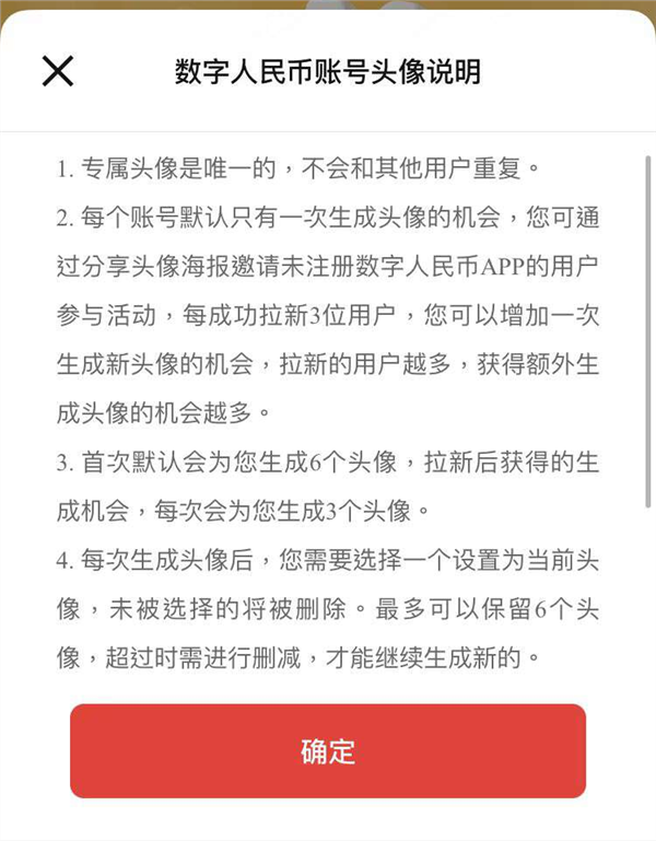 专属头像功能是指用户可以从APP自动生成的6个头像中,选择一个作为自己的专属头像。据了解,APP生成的头像是以数字人民币IP“圆圆”形象为基础。